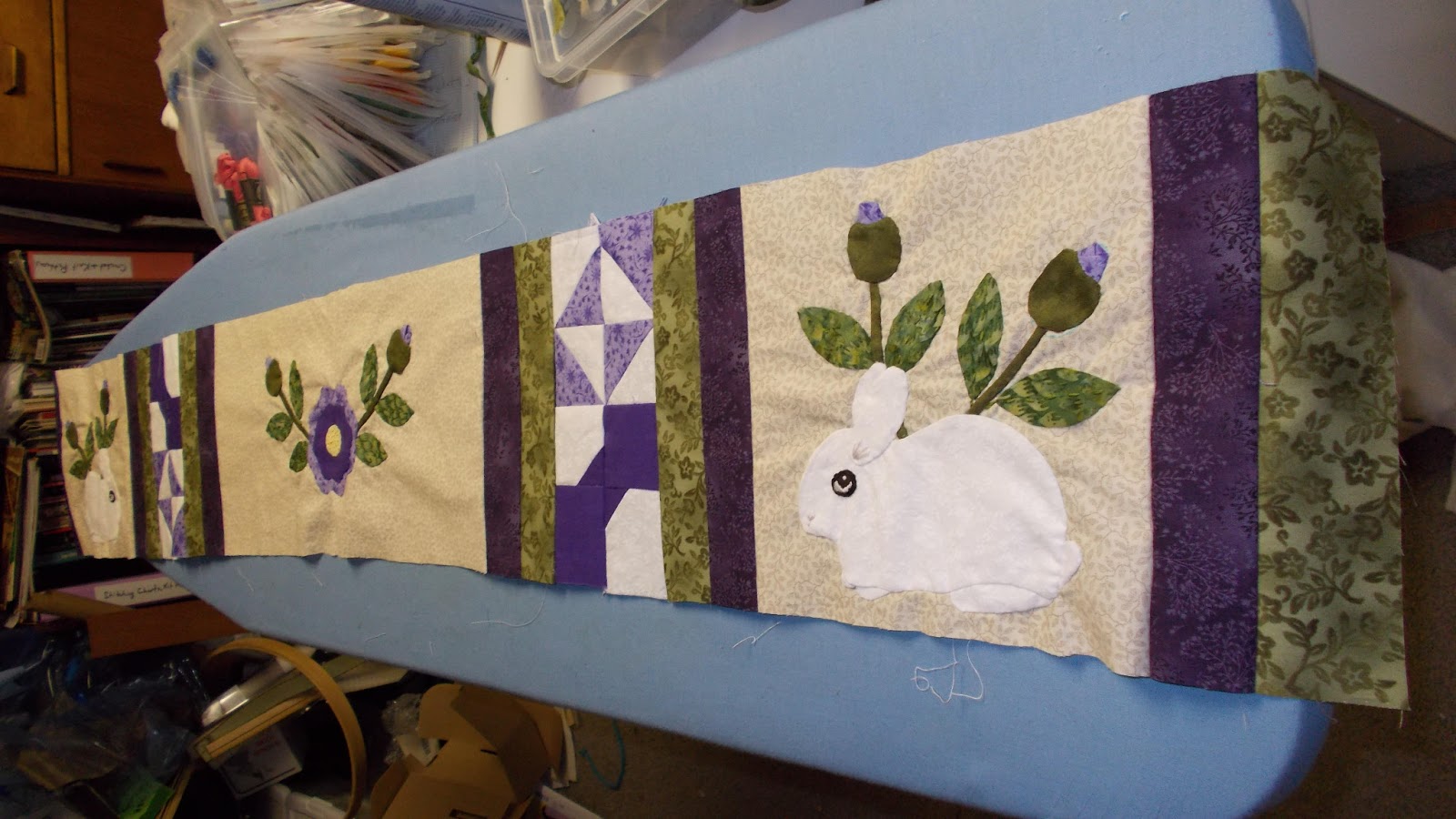 The batting is already cut to size. I don't have a picture, but I'm using white flannel. It won't be too bulky to set things on this way. Now I just need to decide on the backing fabric and get it pieced. I have some fabric in my stash that I've been planning to use for this, but the manager of the quilt shop showed me some adorable fabric that has white bunnies and purple flowers on it. I might have to change gears and use my other fabric for the binding only.